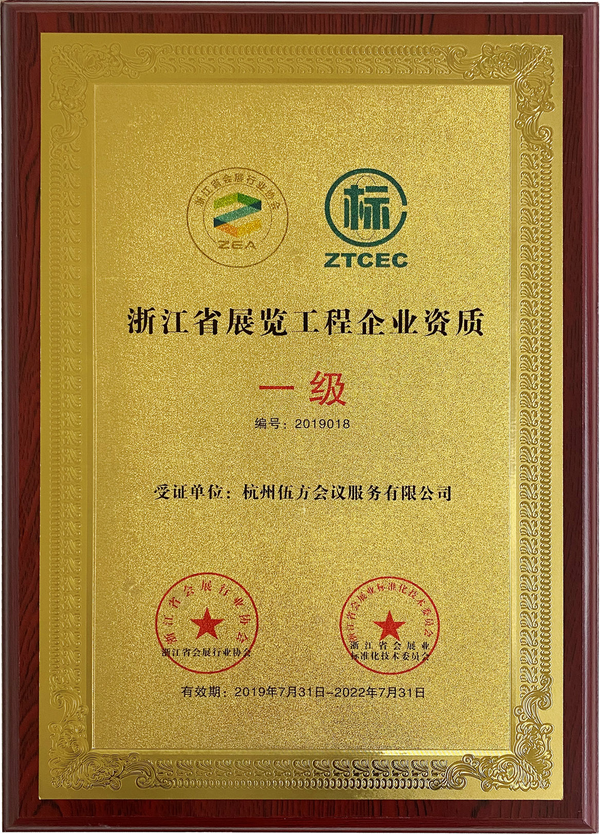 杭州伍方會議服務有限公司被浙江省會展行業協會、浙江省會展業標準化技術委員會等單位授予浙江省展覽工程企業資質一級證書。