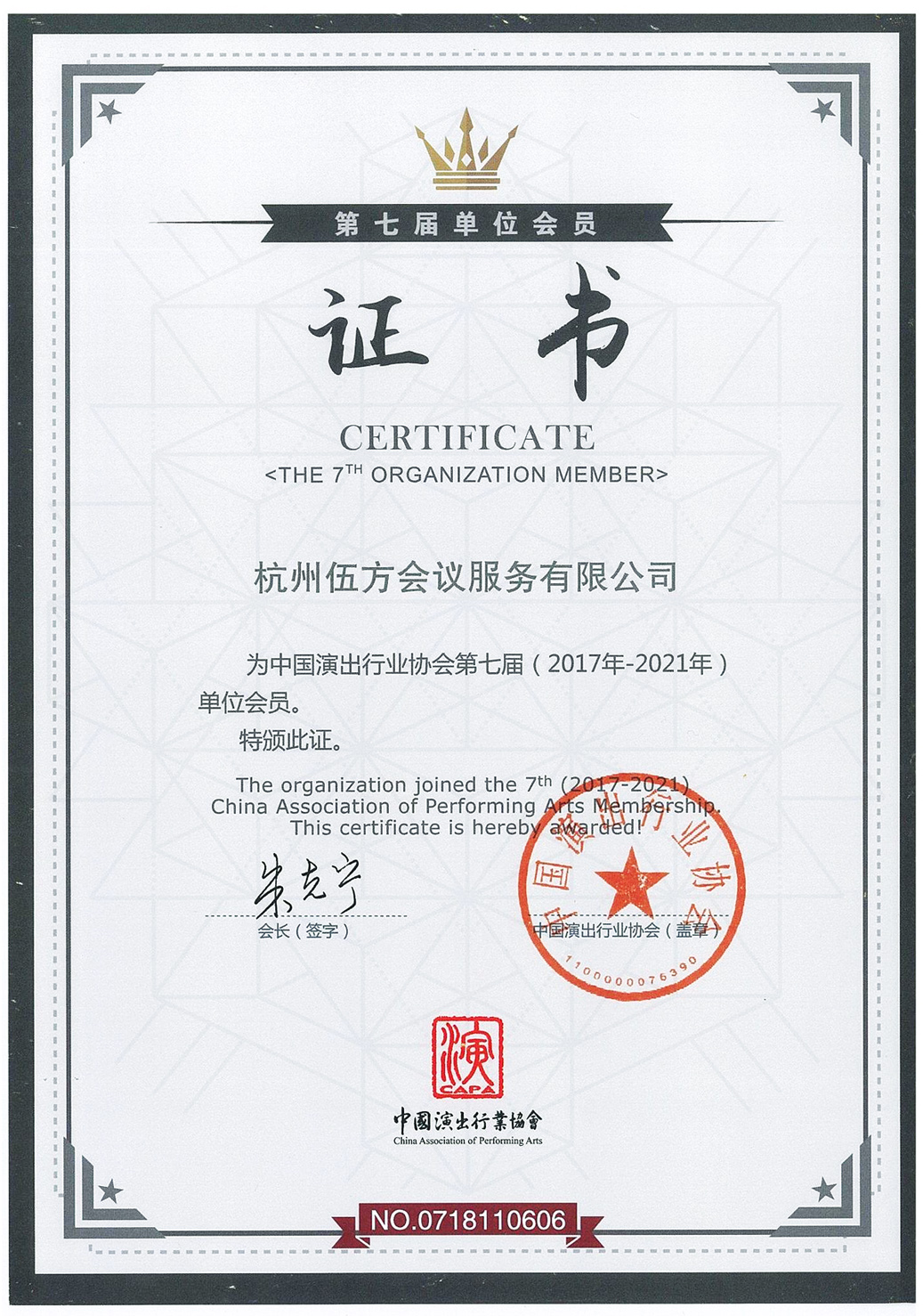 杭州伍方會議會議服務有限公司為中國演出行業協會第七屆(2017年-2021年)單位會員,證書編號:0718110606。